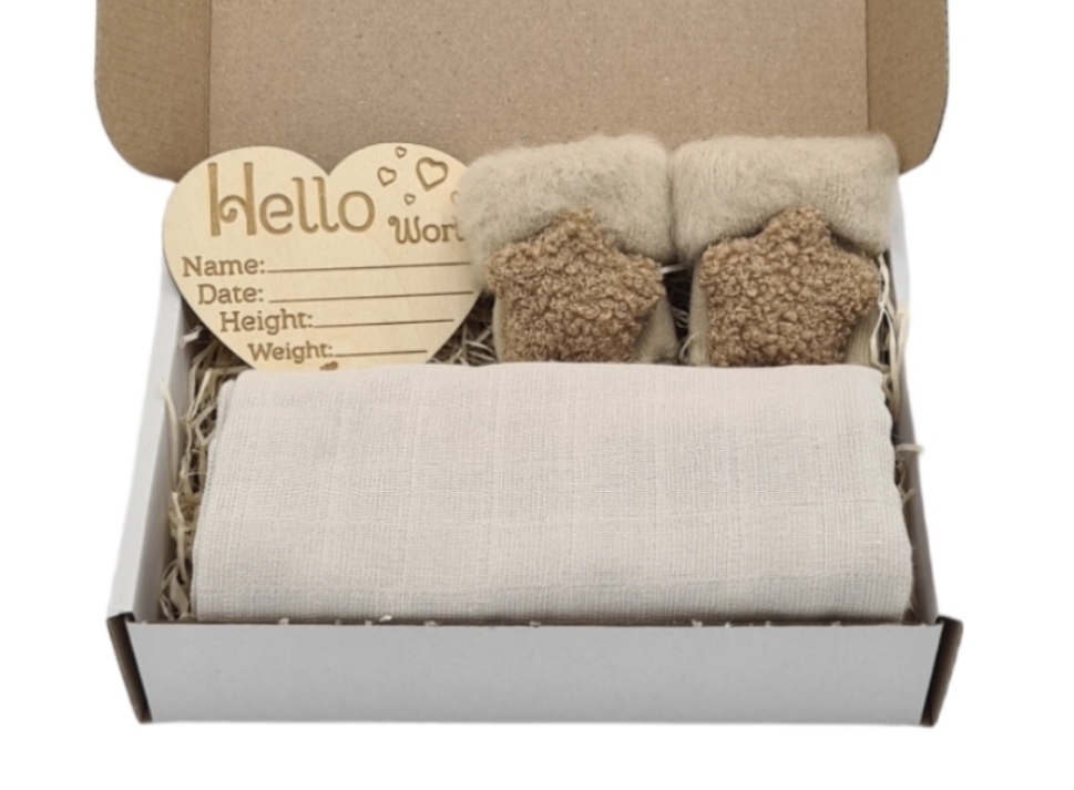 Prisrčen paketek za najnežnejše trenutke ob rojstvu. V njem boste našli: Tetra pleničko iz visokokakovostnega materiala, ki je prijazna do občutljive otroške kože in vsestransko uporabna. Tople in mehke nogavičke, ki bodo poskrbele, da bodo majhne nogice vedno na toplem. Srčkasto tablico, na katero lahko vpišete nepozabne podatke ob rojstvu in tako ustvarite trajen spomin na ta poseben dogodek. Paket je čudovita izbira za darilo ob rojstvu ali kot pozornost, ki izraža toplino in iskreno veselje.